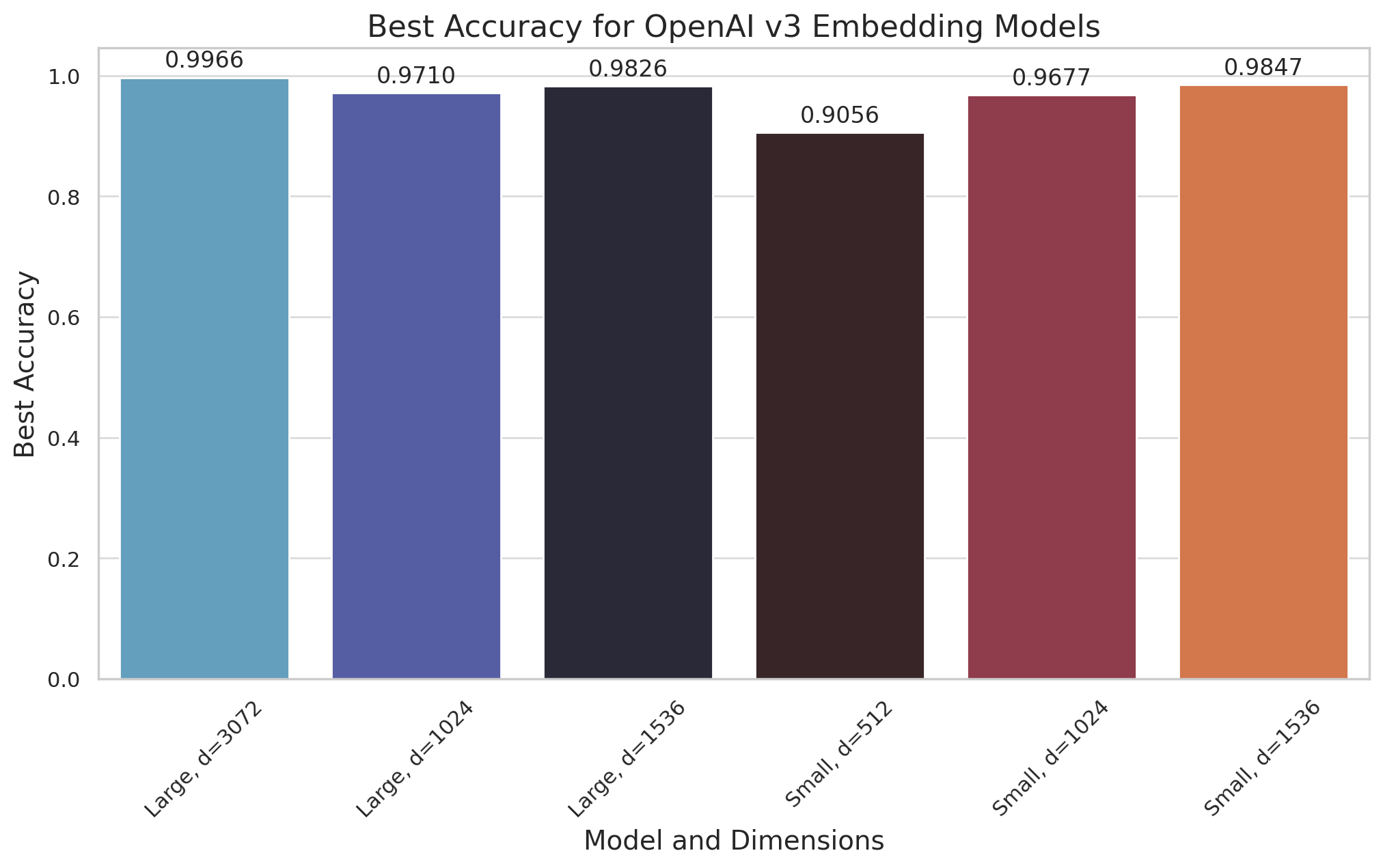 The new OpenAI models have been trained with a novel approach called “Matryoshka Representation Learning”. Developers can set up embeddings of different sizes (number of dimensions). In this post, we use small and large variants. Developers can select embeddings which balances accuracy and size.