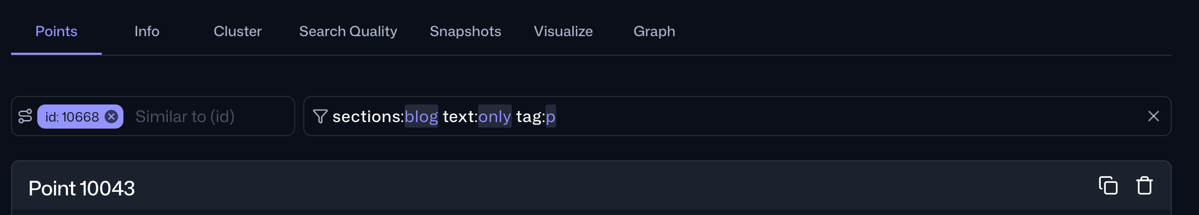 Many people have been asking about point filtering in web UI. And now it’s back, better than ever. In this release, we have redesigned the point search interface in the Web UI to make exploring your data and discovering relevant points easier and more intuitive. The new two-field layout enables searching for points similar to another point, filtering by payload values, and finding points by ID.